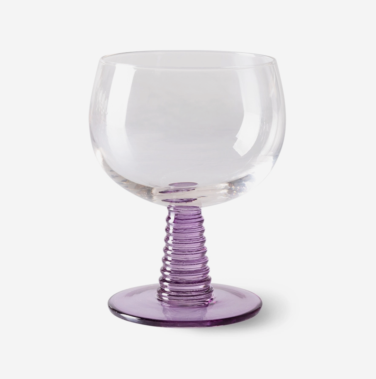 Håndblåst lavt virvlende vinglass med en solid lilla farget glassbunn. Skiller seg ut umiddelbart og gir glasset et lekent uttrykk. På denne måten kan du nyte vinen eller en annen drink enda mer.