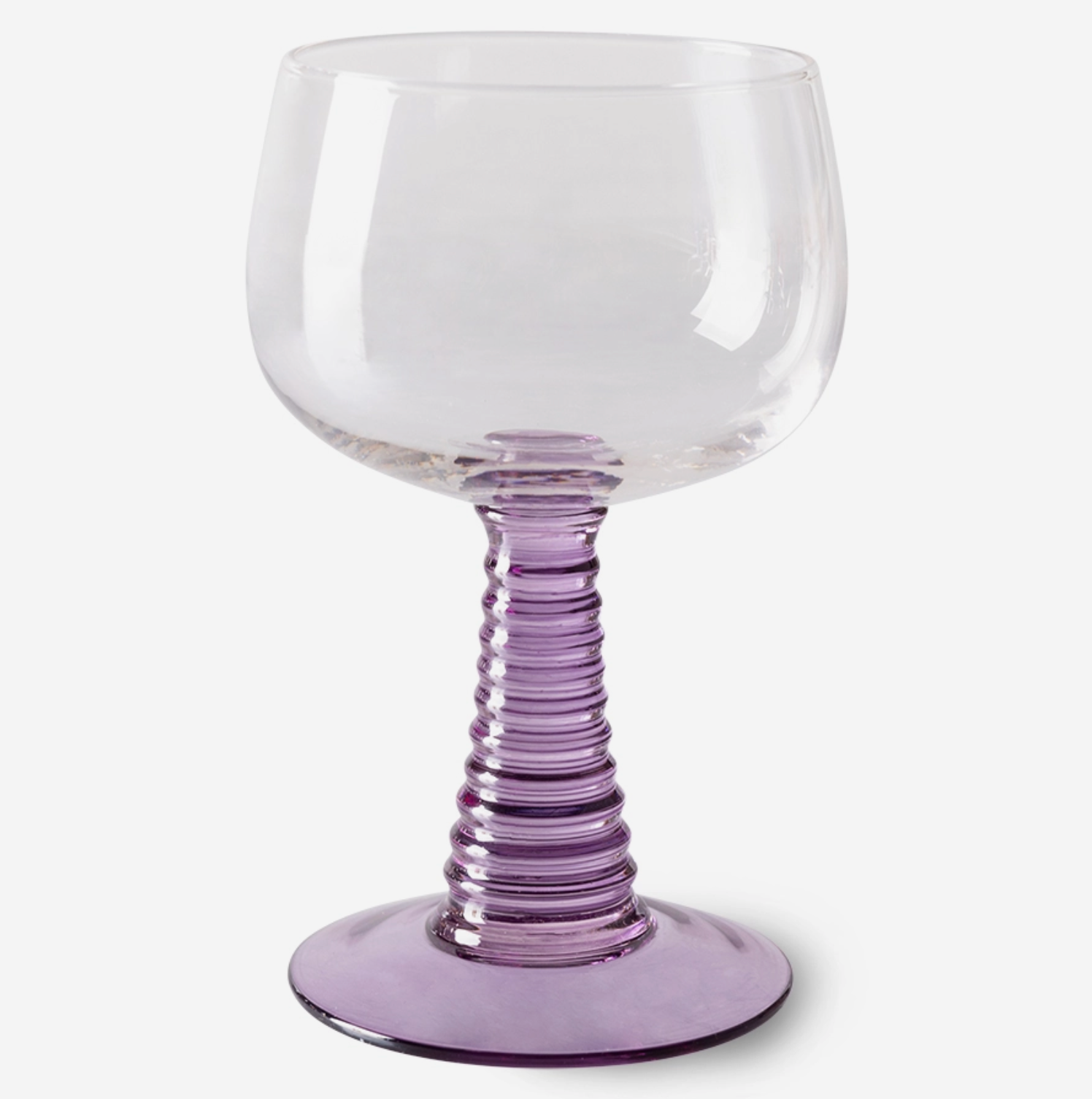 Håndblåst lavt virvlende vinglass med en solid lilla farget glassbunn. Skiller seg ut umiddelbart og gir glasset et lekent uttrykk. På denne måten kan du nyte vinen eller en annen drink enda mer.