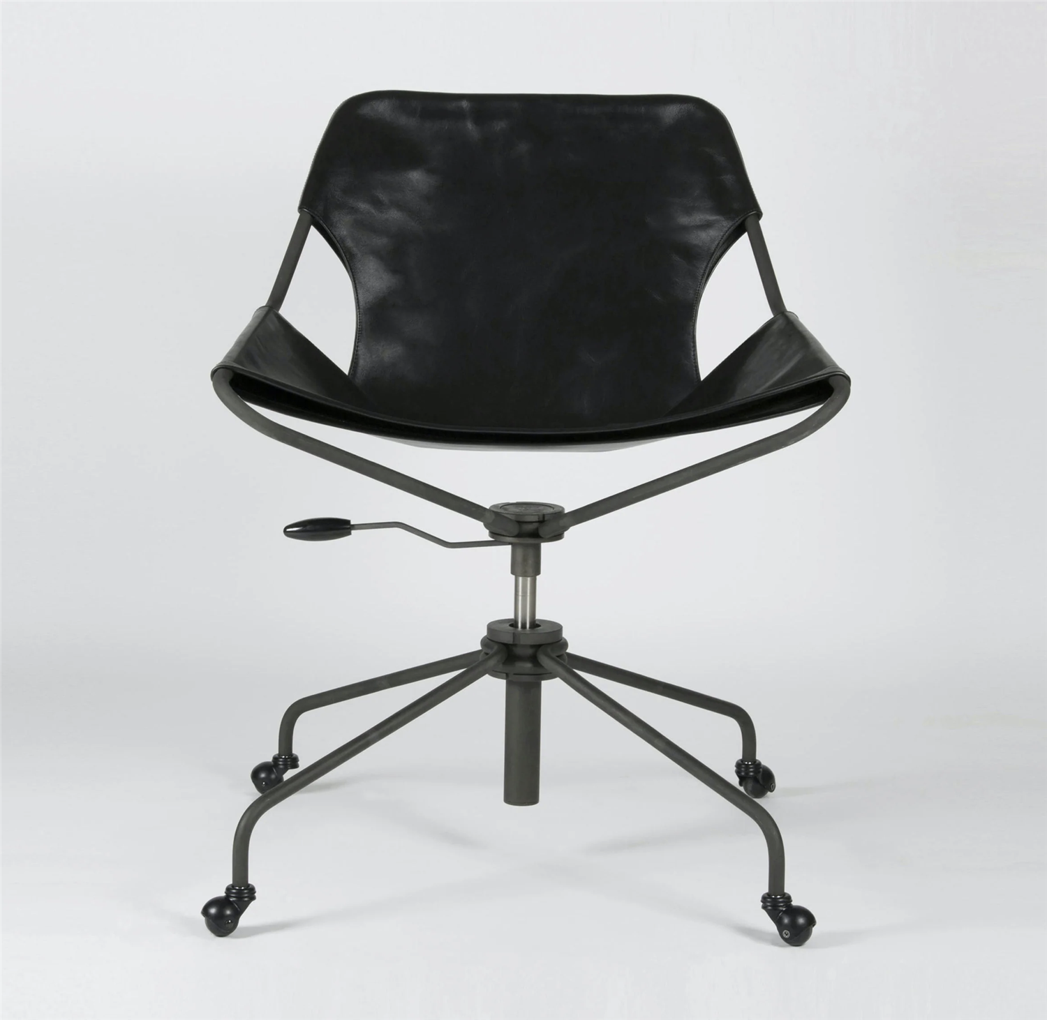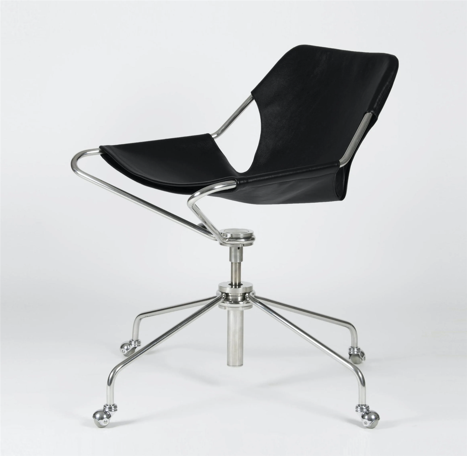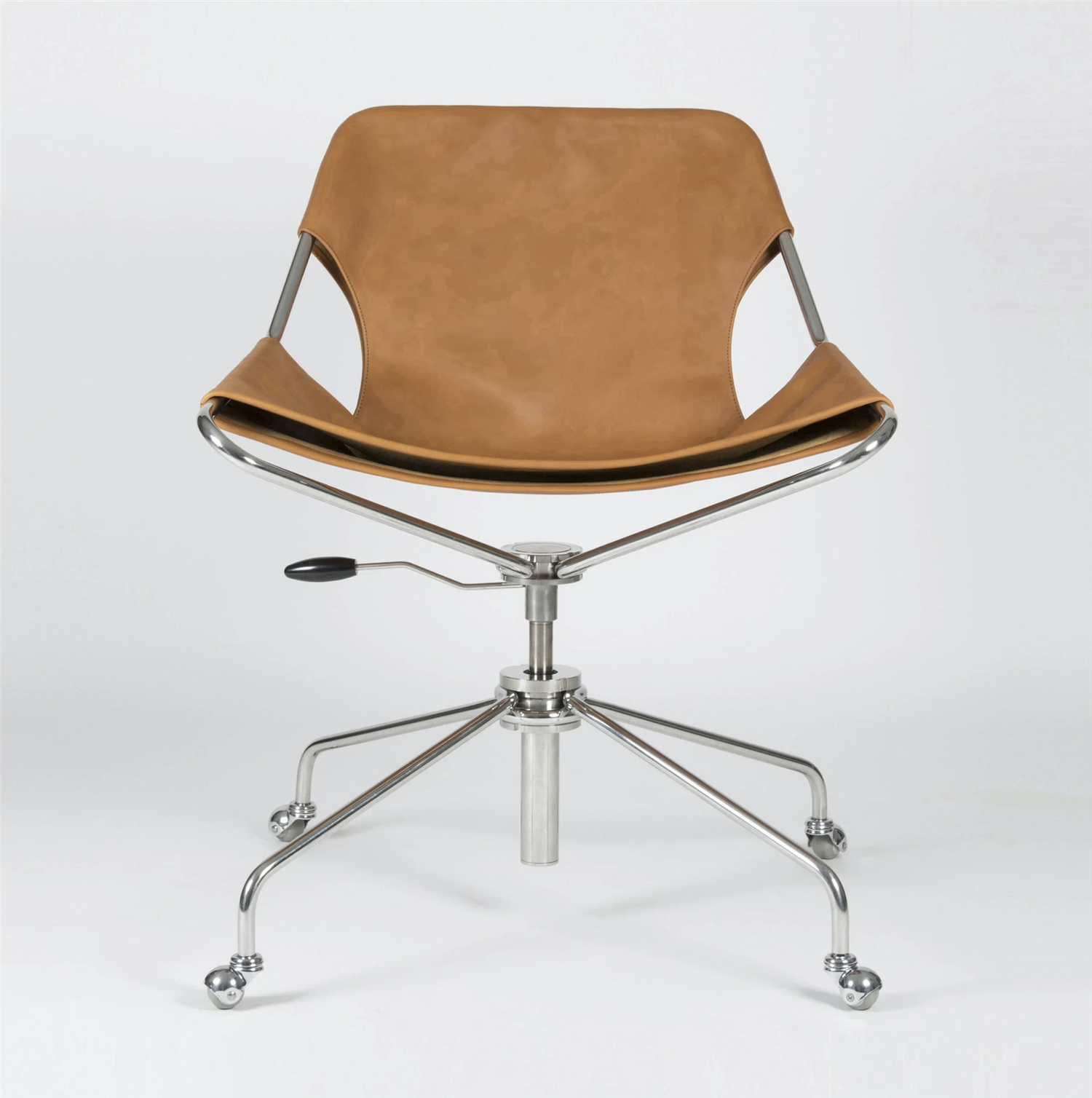 The spring steel frame, presented in its original phosphated carbon steel finish, polished stainless steel, or covered with an extremely durable epoxy paint, is covered with a sensual and deep piece of full grain vegetable leather.