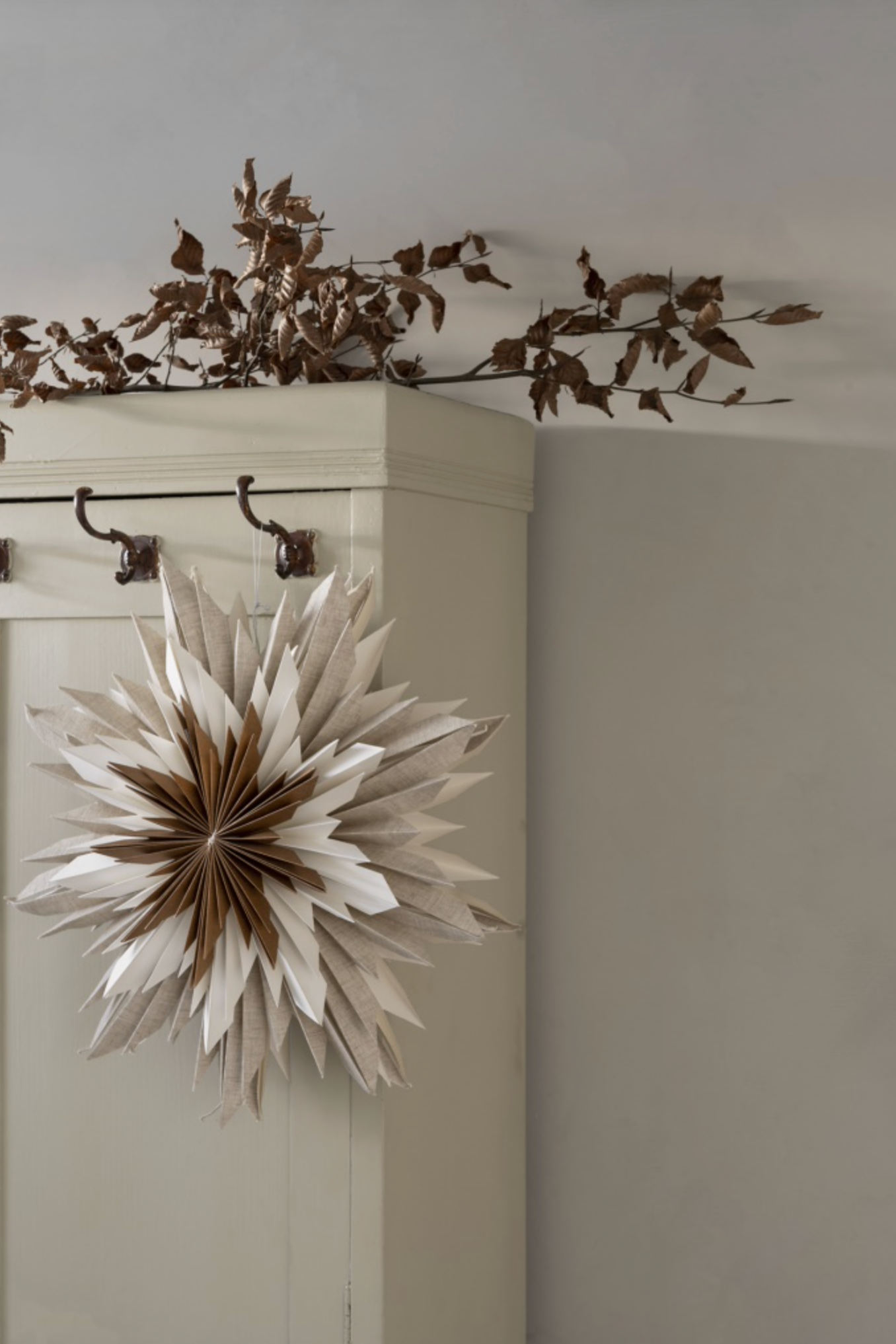 Denne vinteren her flytter syttitallet inn. Papirstjernen Marta er kledd i et naturfarget stoff av linkvalitet. Takket være lang erfaring kan denne leverandøren jobbe med denne typen stoff og den spesielle bretteteknikken som kreves. Et design som er helt unikt i sitt slag. Leveres i en elegant eske for praktisk oppbevaring eller til å gi bort i julegave. Ledning og lyspære selges seperat.