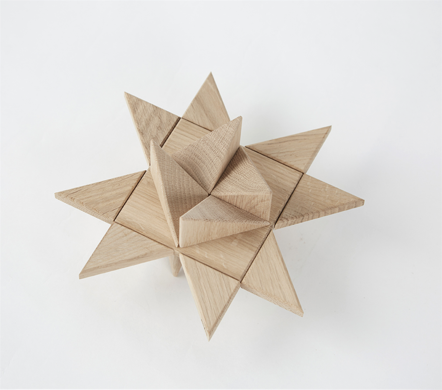 Stjernen er nu blevet til et lysende minde om barndommens juleglæde – her udført i egetræ, som med sine bløde kanter finder sin naturlige plads i vindueskarmen eller på julebordet.