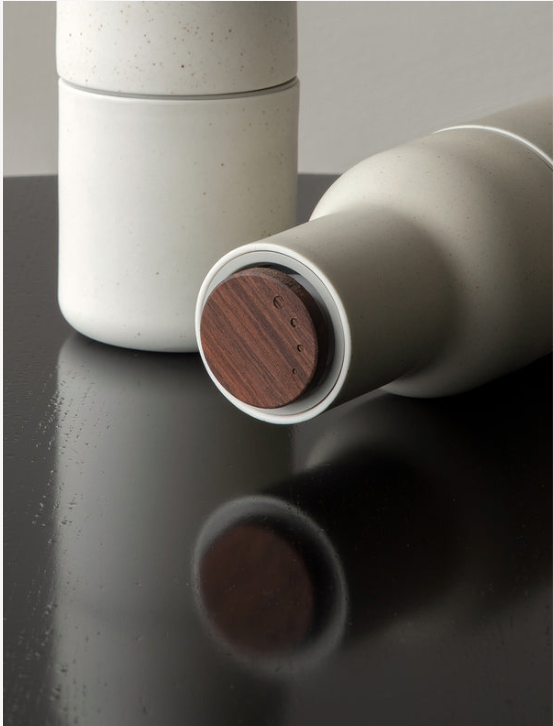 Bottle Grinder krydderkvern i keramikk er formet som flasker og er i en nydelig elfenben farget glasur finish, og med et lokk i valnøttre.