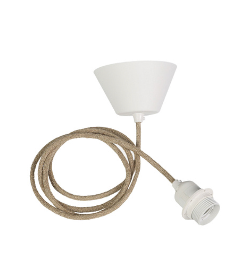 Ceiling cable set with a plastic ceiling cup and elegant textile cable. Use with E27 light sources. 200cm