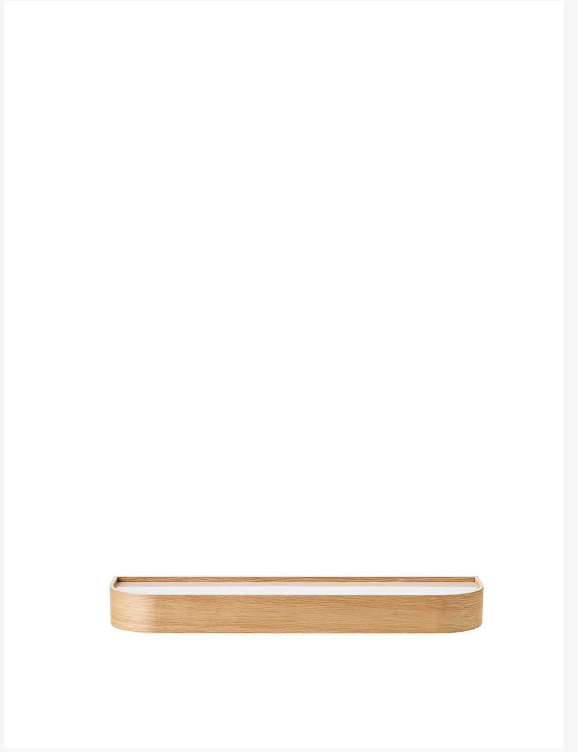 Designed for MENU by Nina Bruun, the Epoch Shelf is crafted in wood veneer and offered in two natural finishes: natural or dark stained oak. The multipurpose, space-saving design features on the one side a deep shelf for everyday clutter and on the other a shelf on which to place decorative objects. Multiples can be suspended in horizontal or vertical rows.