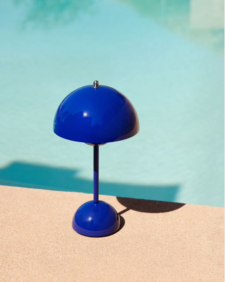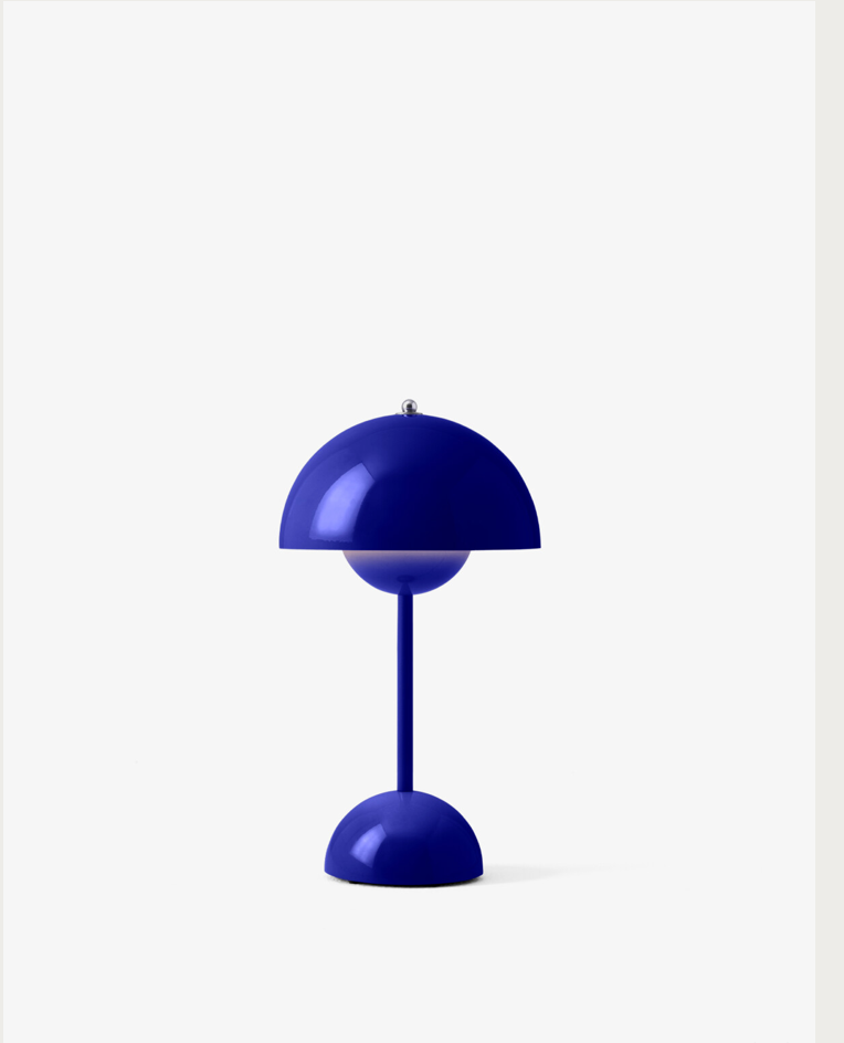 Among the most norm-breaking Danish designs of the 1960s, the iconic form of Verner Panton's Flowerpot is available in a series which now consists of seven different models. In close collaboration with the Panton family, we are pleased to welcome five new and exciting, vibrant colours to our range for 2023: Cobalt Blue, Swim Blue, Vermilion Red, Tangy Pink, Dark Plum. Slightly smaller in size than the table lamp version, and deliberately lightweight, the portable VP9 comes equipped with a USB charging cable, bringing a cozy atmosphere to both indoor and outdoor settings.