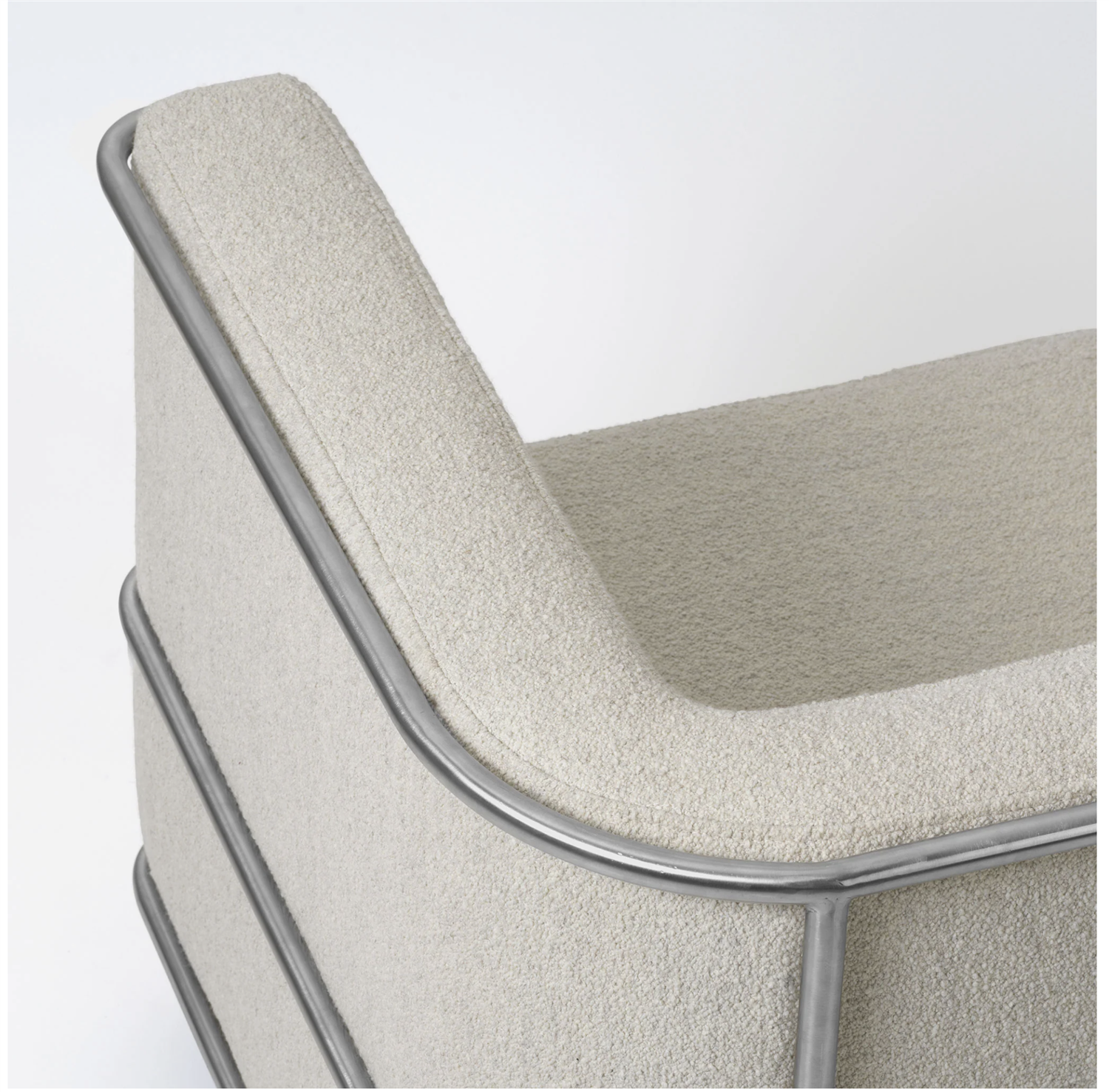 Simple and attractive design that gives this 3 seater a timeless and modern design-approach. The Modernist Sofa adds a relaxed and accessible aura to your home. The solid stainless steel frame of the Modernist sofa is first of all classy and elegant and a key design feature that also provides a solid construction. The upholstery is made using durable, high-density foam covered with beige bouclé for extra super soft feel. The upholstery follow the curves of the stainless steel frame in the most elegant way forming both the backrest and armrest of the sofa in one single movement. The Modernist Sofa is available in a grey wool 3 seater and as a 2 seater.