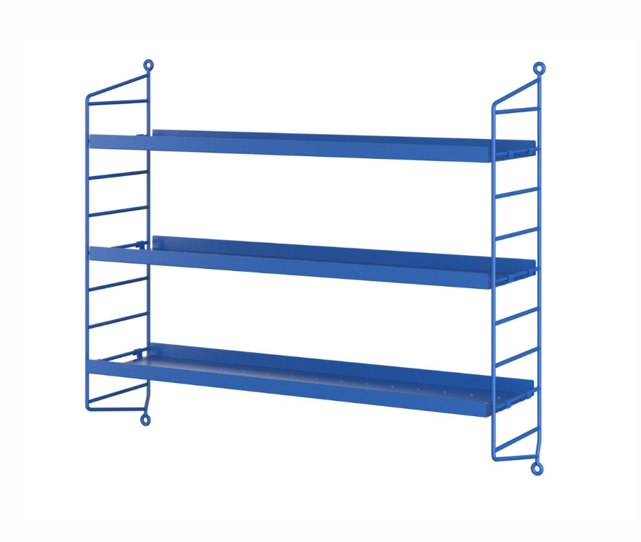 String® Pocket metal is sold as a complete shelf but is equally flexible as String® System. String® Pocket invites creativity and personality where you can combine two or three String® Pocket shelves into one larger shelf. Mix and match different colours to suit your style and preferences. The perforated metal shelves with low edge, 2 cm, makes it possible to add hooks and rods (30 cm and 58 cm) to increase the storage possibilities. String® Pocket metal is sold as one complete unit containing two wire panels, height 50 cm, and three metal shelves, width 58 cm and depth 15 cm.