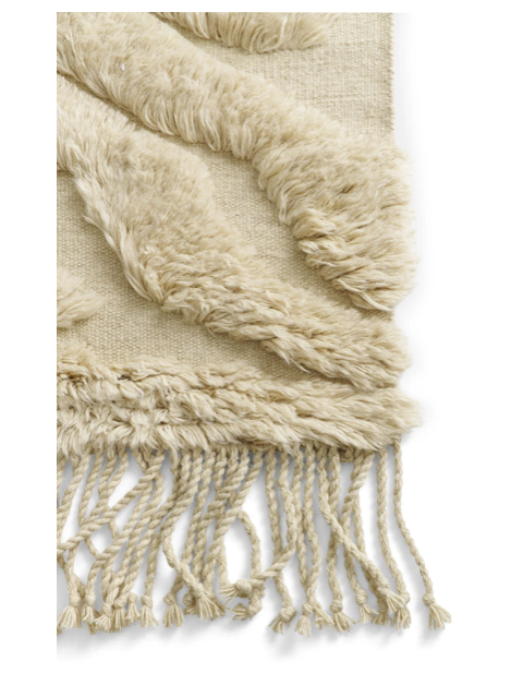 Colonnade no.04 has a soft irregular pattern that creates a vivid and intriguing feel. The rug is crafted in natural and unbleached wool in a soft light beige high pile and backing. Its long fringe-edge elevates the look and adds and artistic detail.