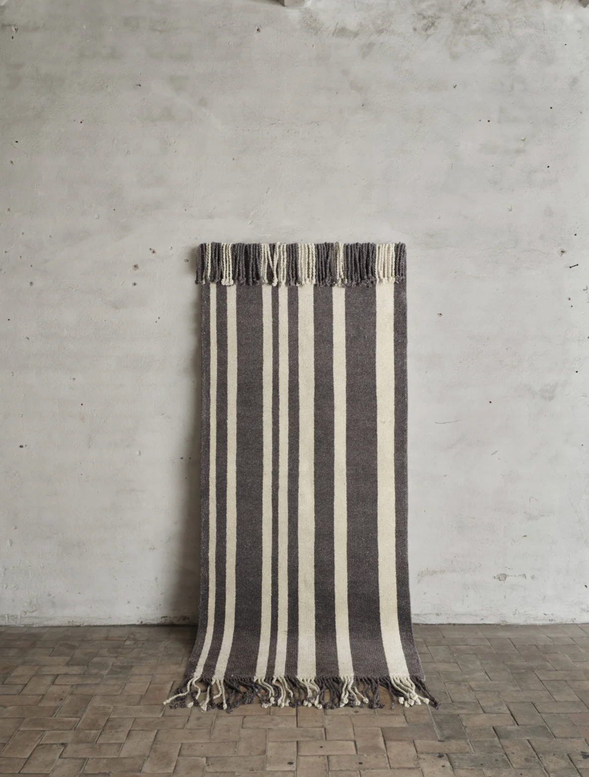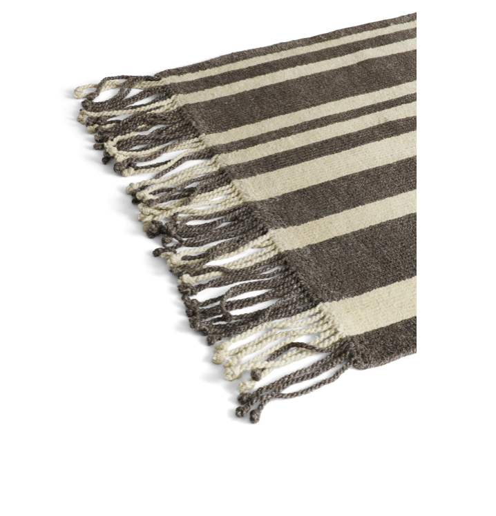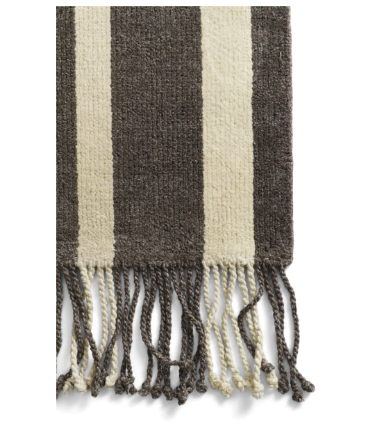 Colonnade no.05 is a hand-knotted low pile rug. The soft contrast between the dark brown/grey and sandy beige creates an eclectic and bold signature piece for hallways and narrow spaces. Adding long fringes elevates both end lines and adds an artistic detail.