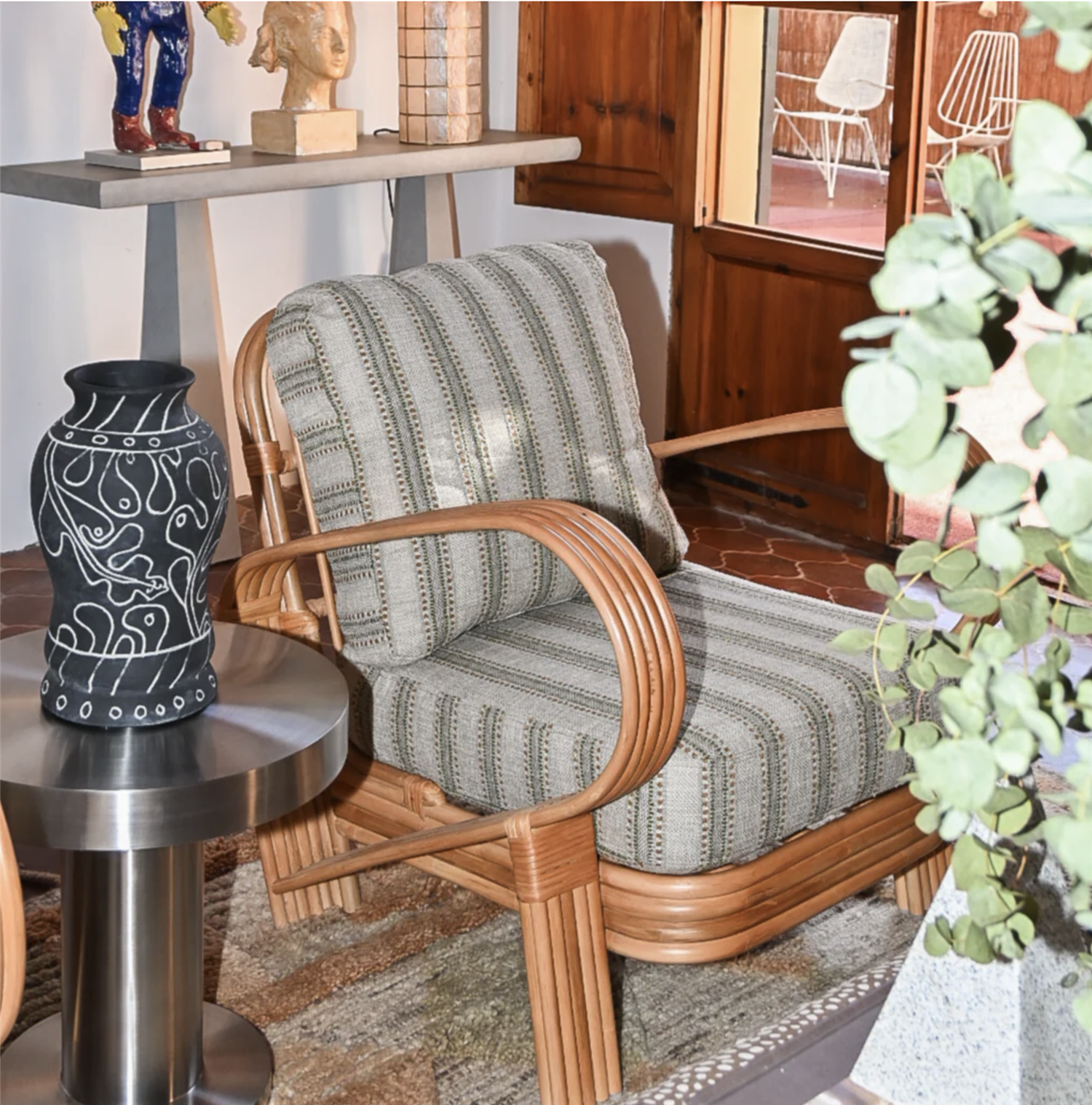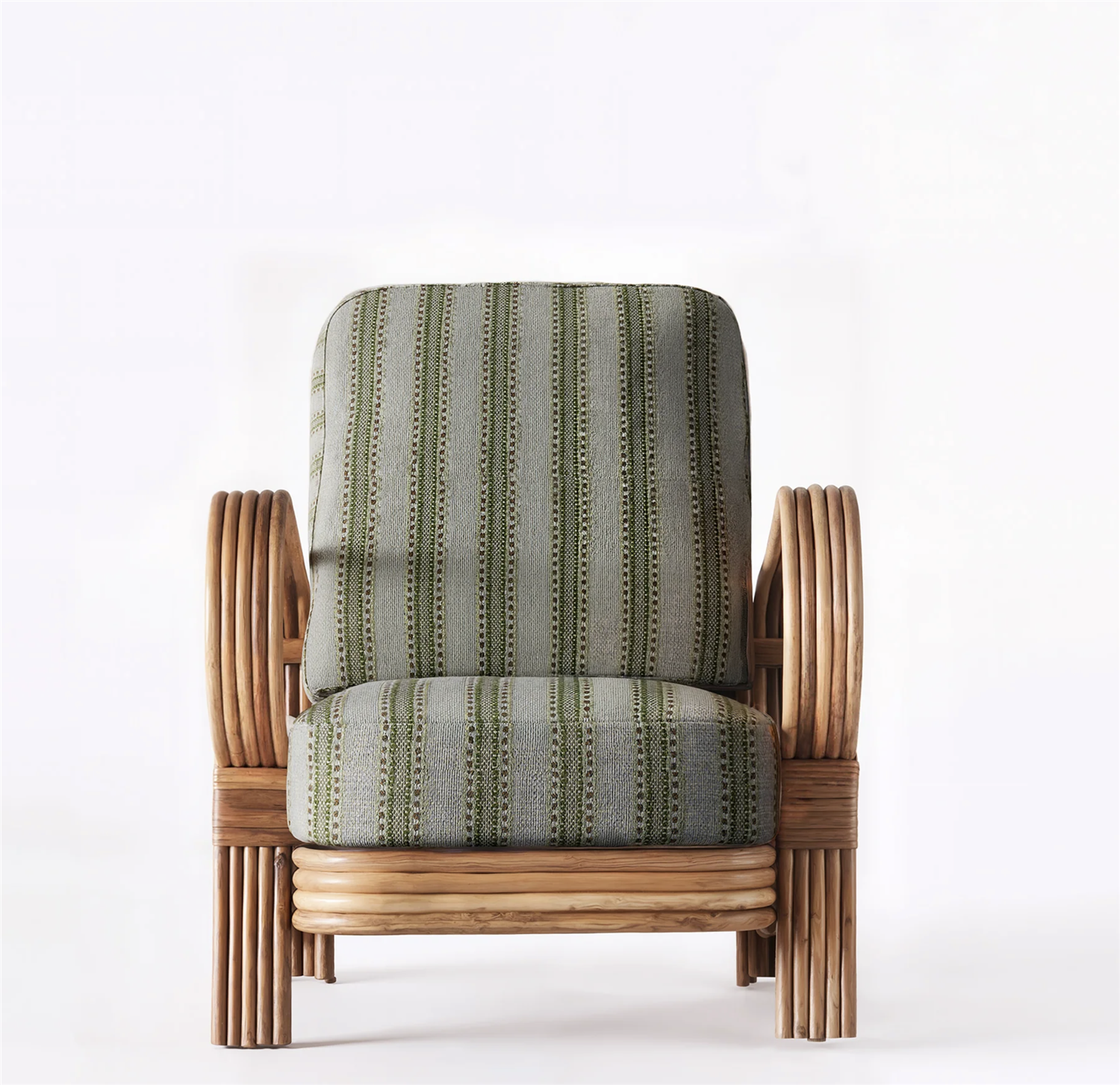 The Bamboo Lounge Chair is an armchair made of bamboo. The bamboo has been lightly stained to give the material a vintage feel. The bamboo frame is contrasted by a seat cushion and back cushion in a beige linen fabric.