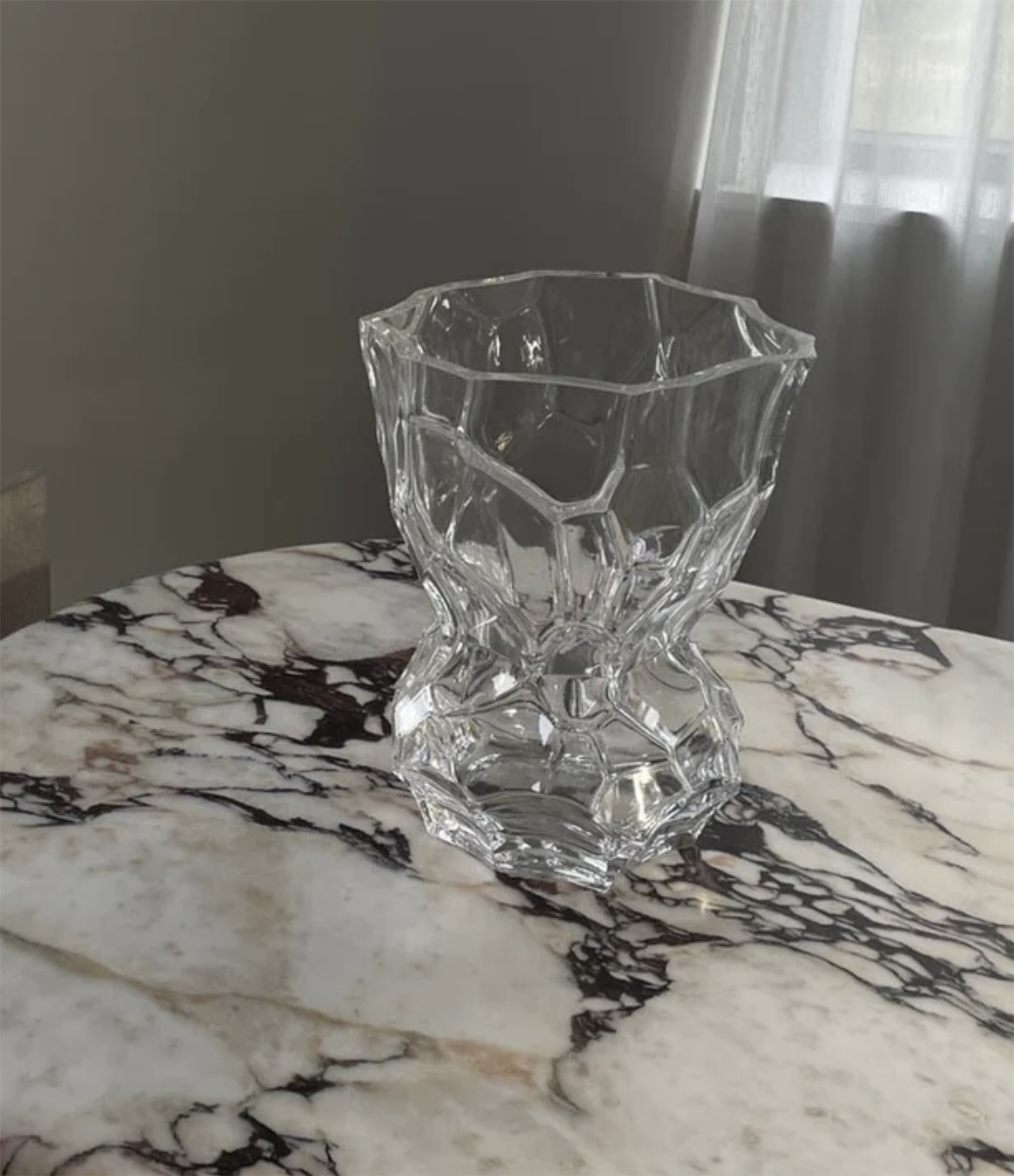 The mould is made in one grand piece and with each angle carved differently It creates a new perspective when turning the vase around. Making the vase equally as beautiful without flowers as with.