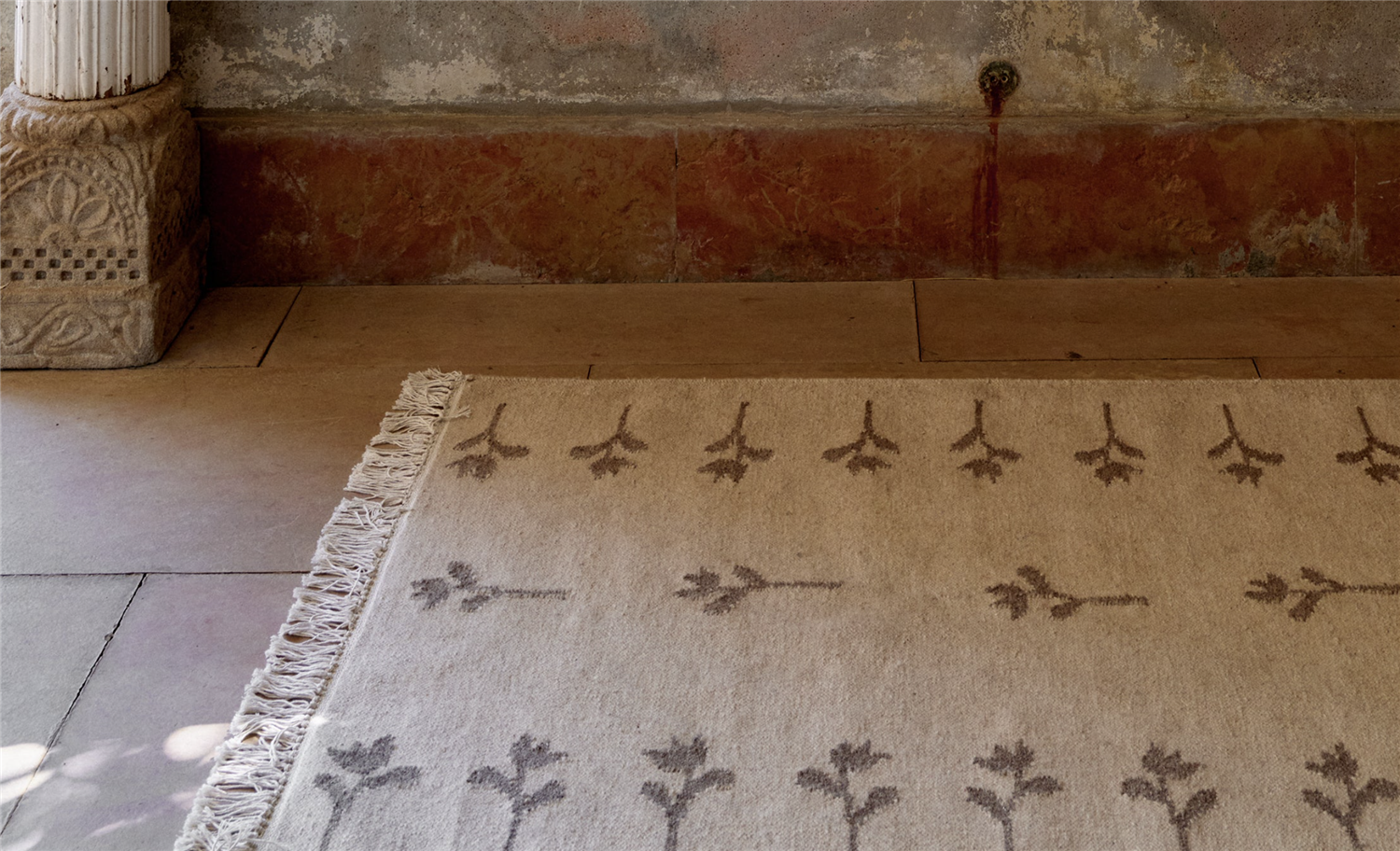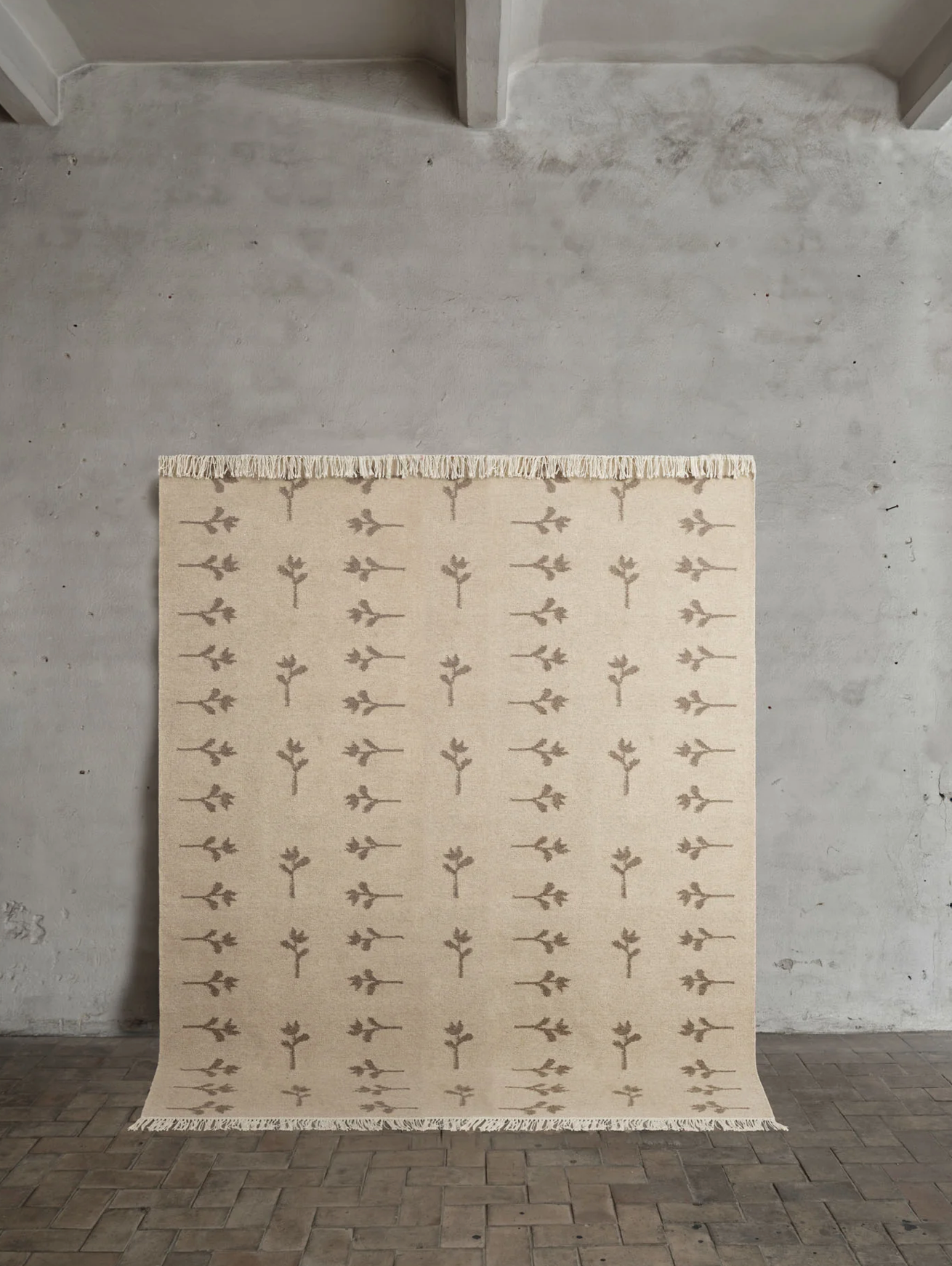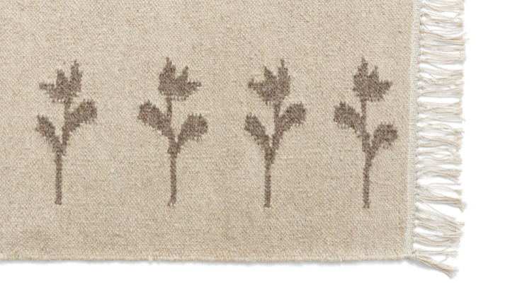 Rug no.17 is a light flat-woven, handmade rug in natural wool. The rug is designed in a mid-beige foundation with soft-brown woven flowers for a natural impression. The flowers draw inspiration from ancient Scandinavian tulip patterns that traditionally adorn everything from porcelain to carpets and curtains. A thin fringe row decorates the edges, providing a simple butimportant detail to the overall design.