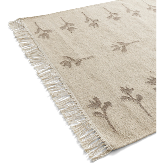 Colonnade no.08 is a light flat-woven, handmade rug in natural wool. The rugis designed in a mid-beige foundation with soft-brown woven flowers for natural impression. The flowers draw inspiration from ancient Scandinavian tulip patterns that traditionally adorn everything from porcelain to carpets and curtains. A thin fringe row decorates the edges, providing a simple butimportant detail to the overall design.