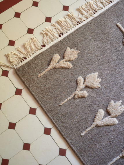 Colonnade no.09 is a grey-brown flat-woven rug with light beige hand-knotted floral pattern which gives a slightly high-and low effect, made in natural wool. The flower design draws inspiration from ancient Scandinavian tulip-patterns and brings forth a homage to these roots. A light fringe row decorates the edges, providing a simple but important detail to the overall design.