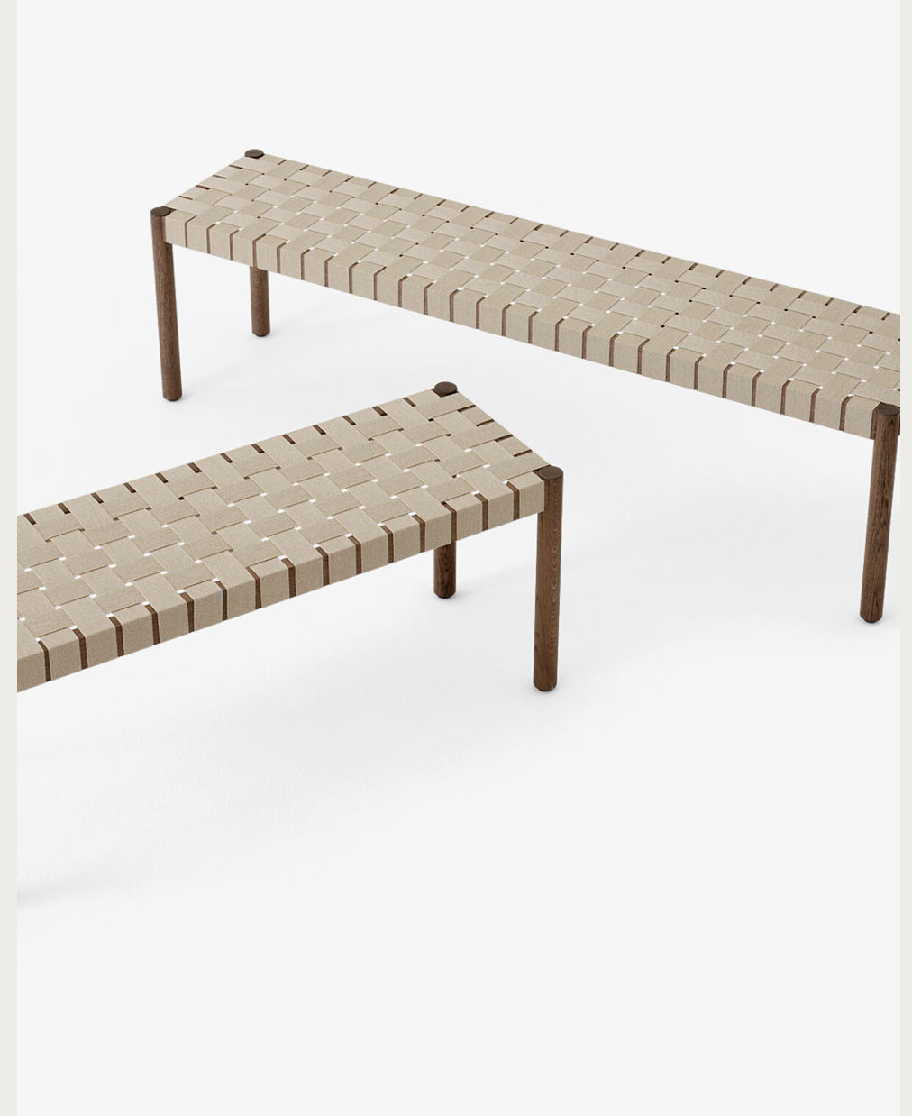Named after the Betty Nansen theatre in Copenhagen, this bench is made from exposed webbing hand-crafted from natural linen fibres. Its frame is available in four colour and material combinations: Lacquered Solid Oak with natural webbing, Black Lacquered Ash with natural webbing, Black Lacquered Ash with black webbing, and Smoked Oiled Oak with natural webbing. The bench comes in two lengths: 105cm and 157cm.