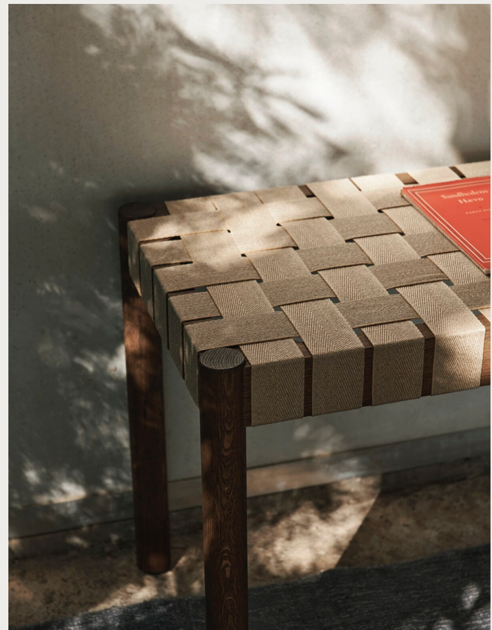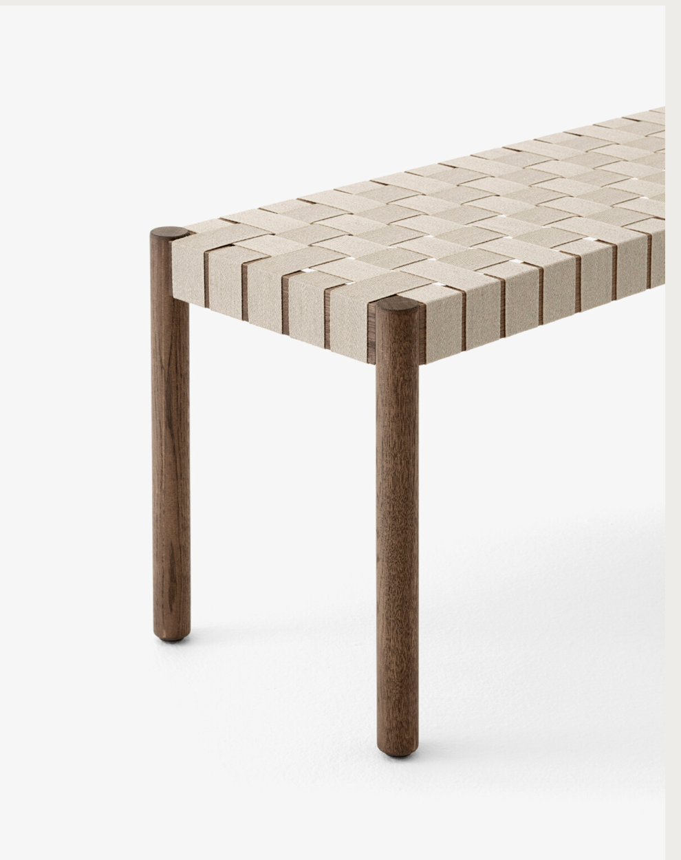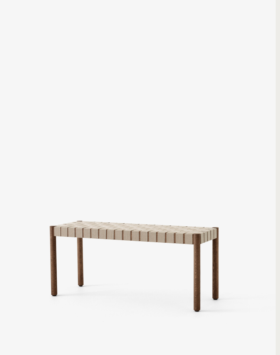 Named after the Betty Nansen theatre in Copenhagen, this bench is made from exposed webbing hand-crafted from natural linen fibres. Its frame is available in four colour and material combinations: Lacquered Solid Oak with natural webbing, Black Lacquered Ash with natural webbing, Black Lacquered Ash with black webbing, and Smoked Oiled Oak with natural webbing. The bench comes in two lengths: 105cm and 157cm.