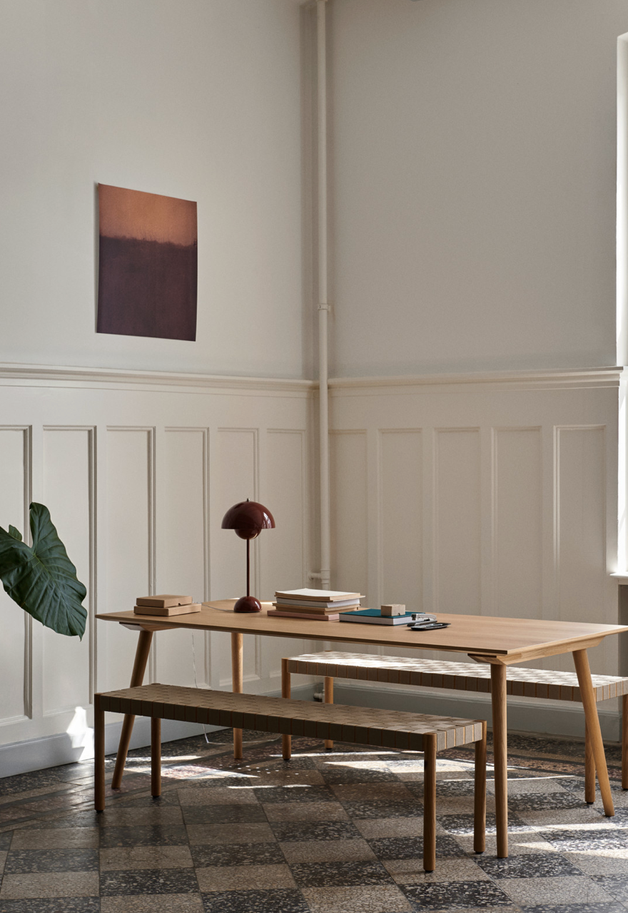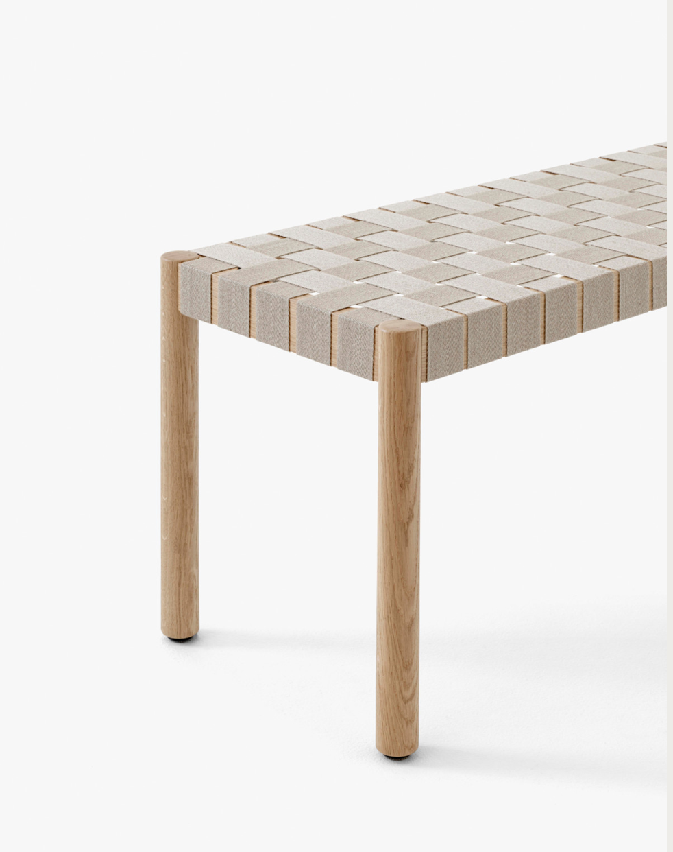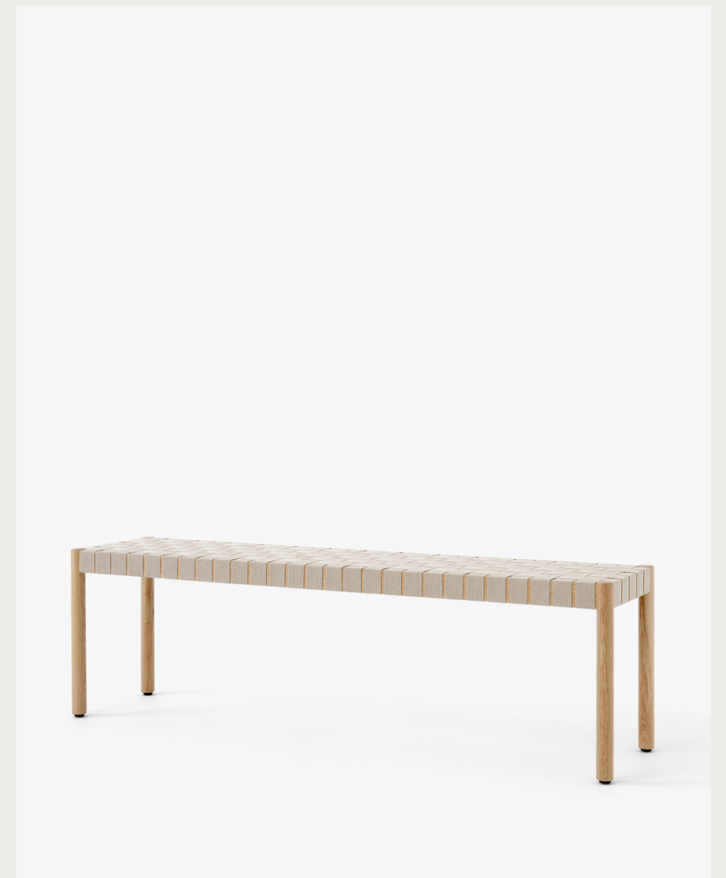 Named after the Betty Nansen theatre in Copenhagen, this bench is made from exposed webbing hand-crafted from natural linen fibres. Its frame is available in four colour and material combinations: Lacquered Solid Oak with natural webbing, Black Lacquered Ash with natural webbing, Black Lacquered Ash with black webbing, and Smoked Oiled Oak with natural webbing. The bench comes in two lengths: 105cm and 157cm.