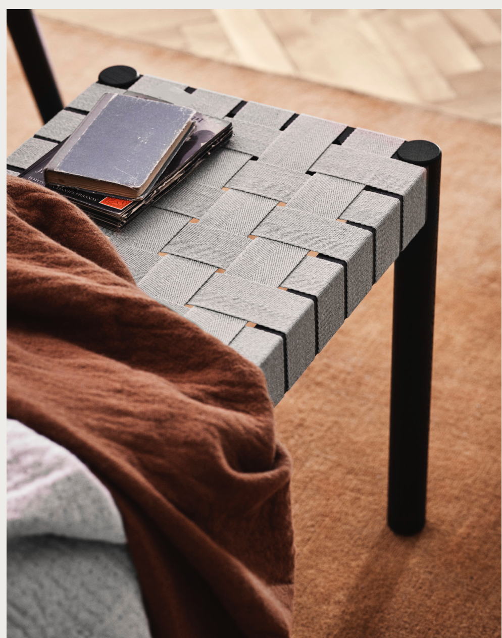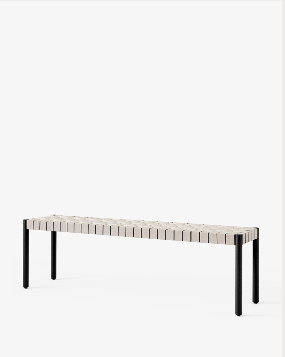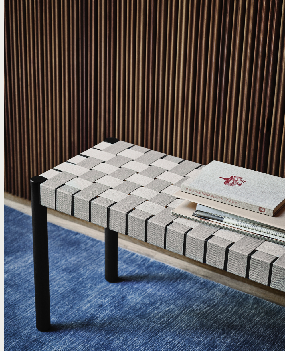 Named after the Betty Nansen theatre in Copenhagen, this bench is made from exposed webbing hand-crafted from natural linen fibres. Its frame is available in four colour and material combinations: Lacquered Solid Oak with natural webbing, Black Lacquered Ash with natural webbing, Black Lacquered Ash with black webbing, and Smoked Oiled Oak with natural webbing. The bench comes in two lengths: 105cm and 157cm.