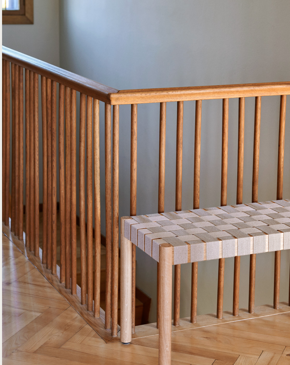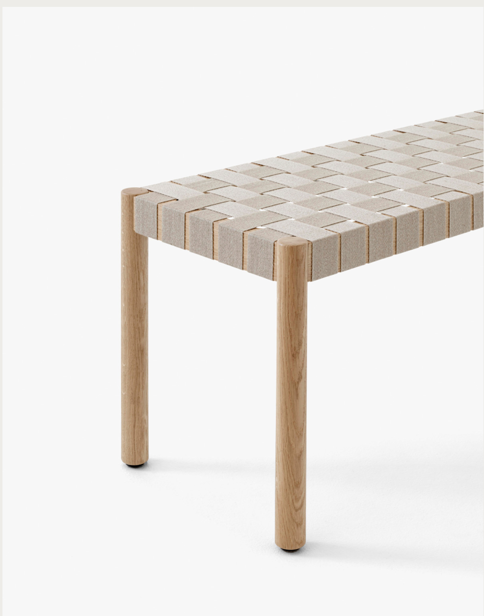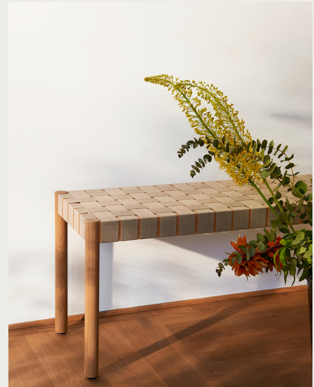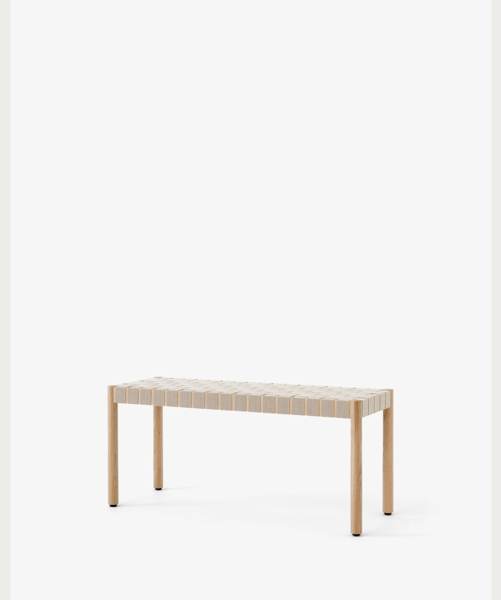 Named after the Betty Nansen theatre in Copenhagen, this bench is made from exposed webbing hand-crafted from natural linen fibres. Its frame is available in four colour and material combinations: Lacquered Solid Oak with natural webbing, Black Lacquered Ash with natural webbing, Black Lacquered Ash with black webbing, and Smoked Oiled Oak with natural webbing. The bench comes in two lengths: 105cm and 157cm.
