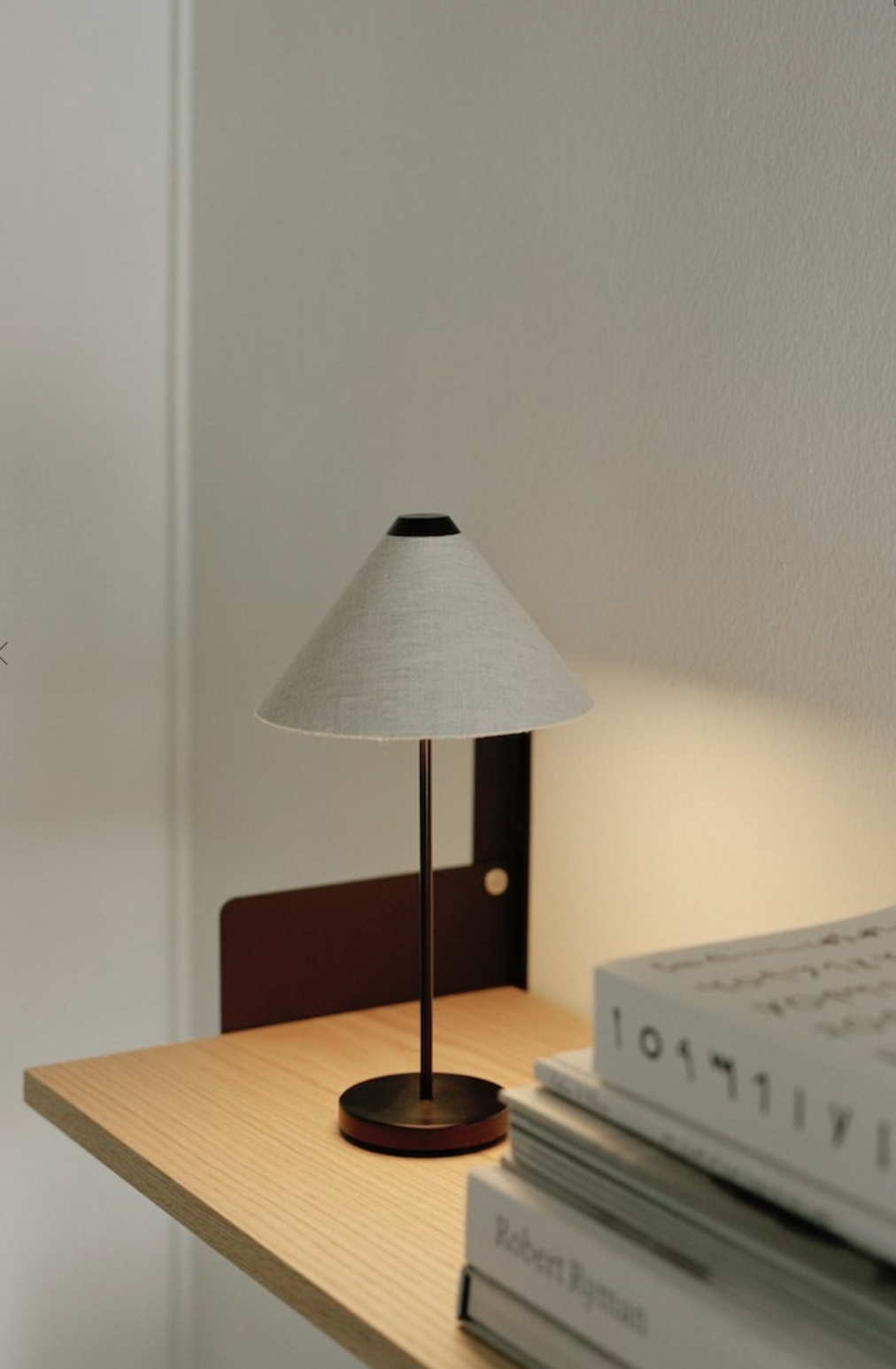 Brolly er en portable bordlampe i børstet stål, der illustrerer styrken ved enkle former. Præcis og velovervejet i sit formsprog demonstrerer den lille lampe den form for omhyggelig, nærmest vildledende, enkelhed, der kan indgå som en tidløs detalje i ethvert rum. Selvom designet holder sig til en streng geometri, opnår lampen en raffineret og let finurlig tilstedeværelse fra den delikate stang, der bærer den koniske lampeskærm. En tretrins lysdæmper på toppen af lampeskærmen er intelligent integreret i designet og gør det nemt at bruge lampen. Brolly oplades med et magnetisk ladekabel, som monteres diskret under foden, så lampen stadig kan være i brug, mens den lader.