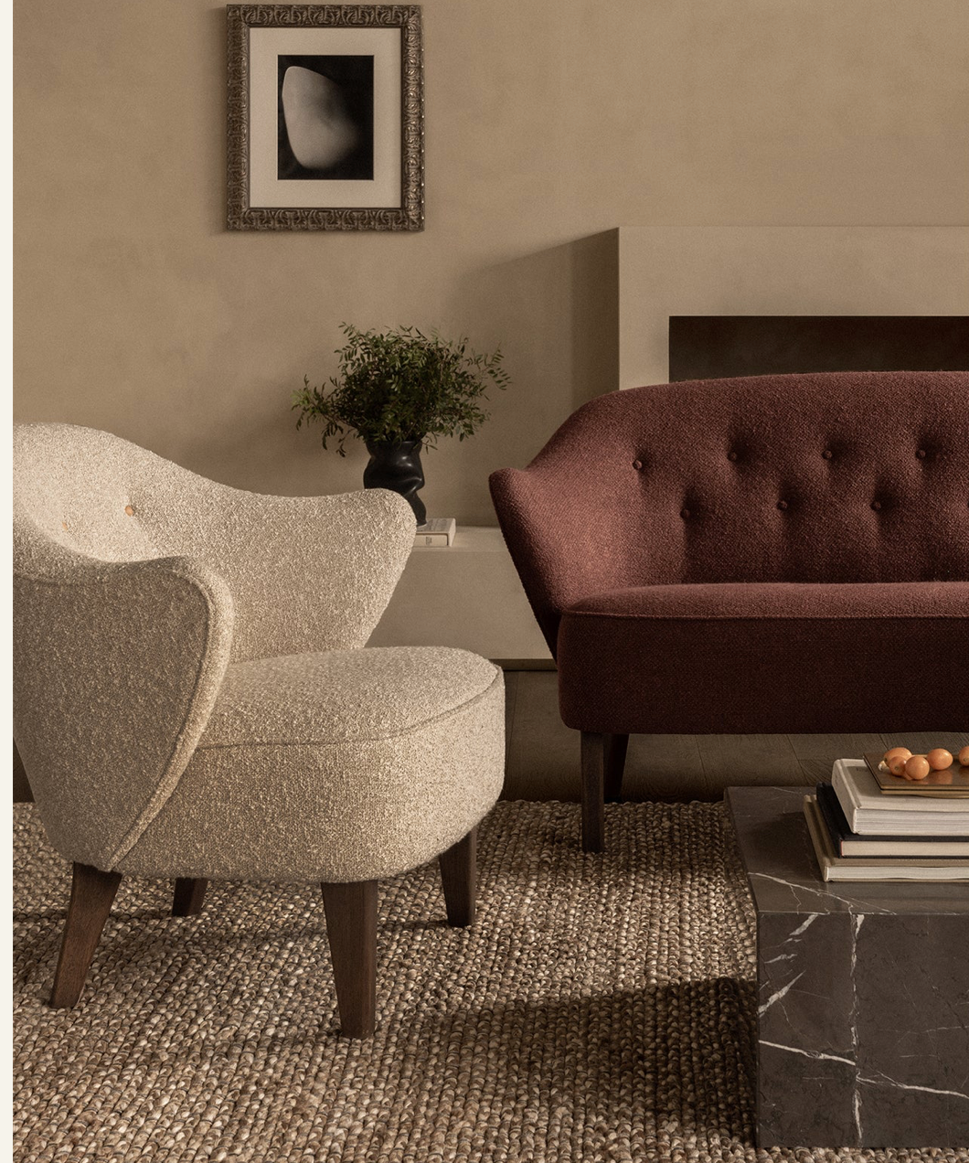 Inspired by the designer's artist mother, Ingeborg Winding, the Ingeborg Lounge Chair (1940) welcomes with open arms and an irresistibly charming expression. Its elegant sculptural armrests and angled frame ensure comfort in a compact size, making a bold statement in any room. With its versatile beauty and space-saving design, Ingeborg effortlessly blends into any space. Originally featuring sheepskin upholstery, the chair has been reimagined from archival drawings and now offers a range of upholstery fabrics and oak leg options. It pairs harmoniously with the matching sofa.